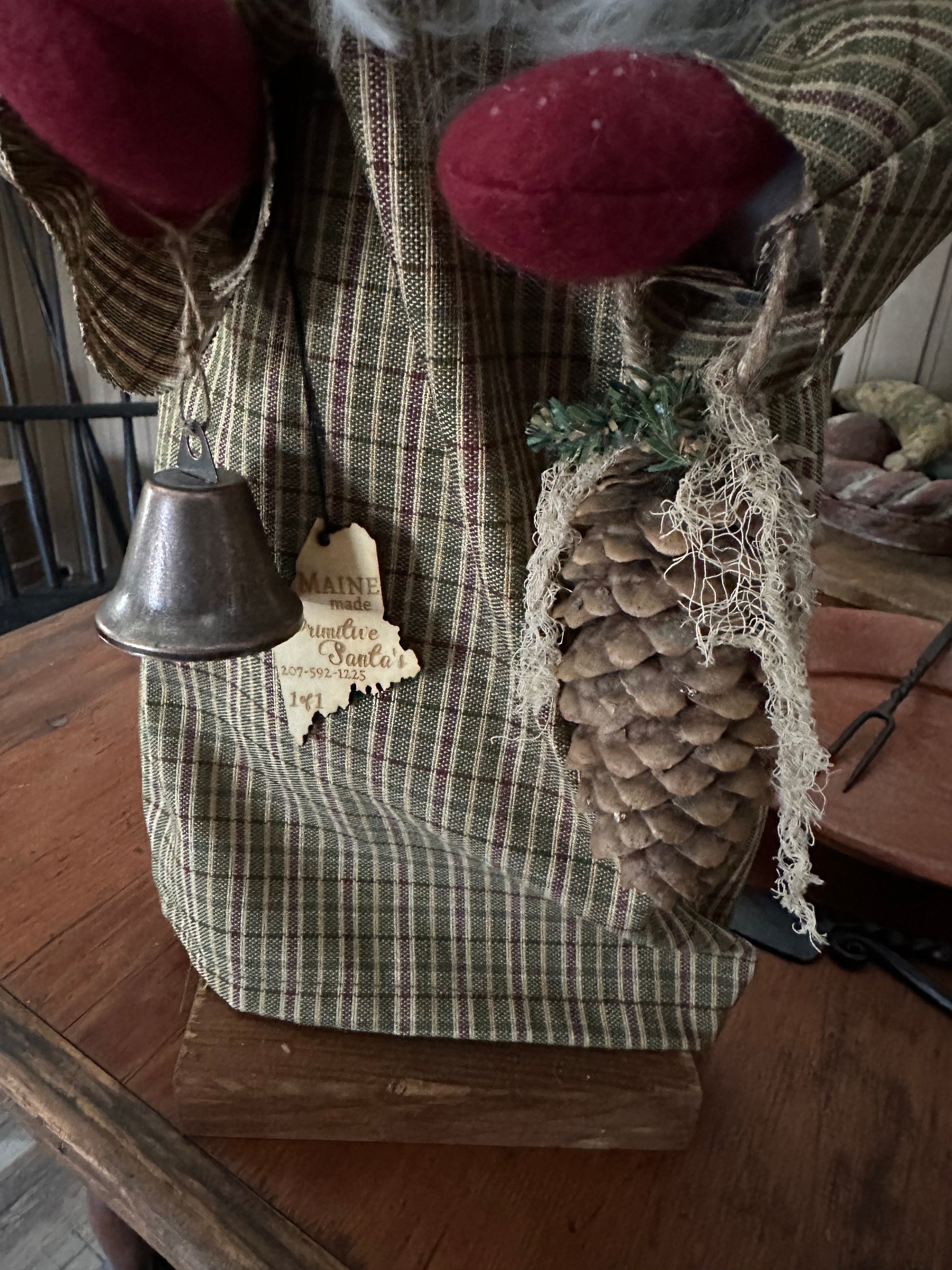 Eliot Santa - Handcrafted Figurine with Plaid Coat & Pine Cone Bell - 20 Inches