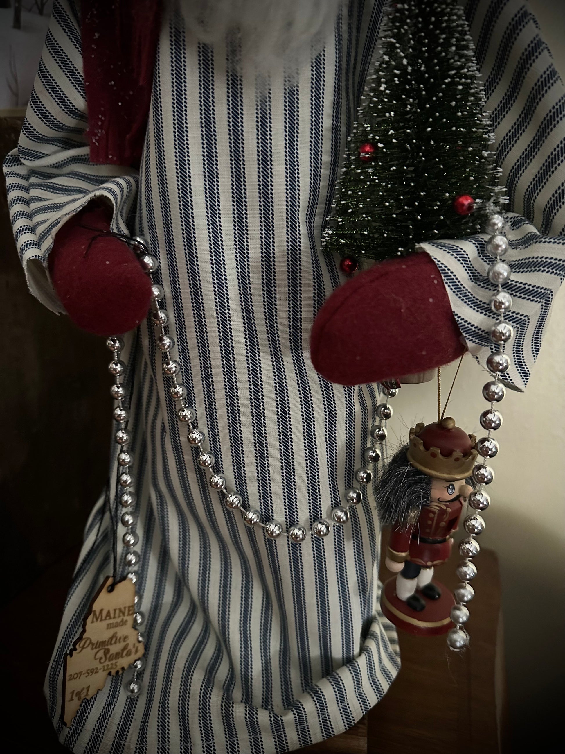 Dressed in a cozy red scarf and red mittens, Ollie Santa exudes the perfect balance of warmth and holiday spirit. His vintage ticking overcoat adds a timeless, rustic touch, while his festive accessories include a vintage hanging bead accent that adds a nostalgic, elegant flair to his look. Ollie Santa also carries a classic bottle brush tree, evoking memories of childhood holidays, and a nutcracker, making him a charming tribute to traditional holiday decorations.