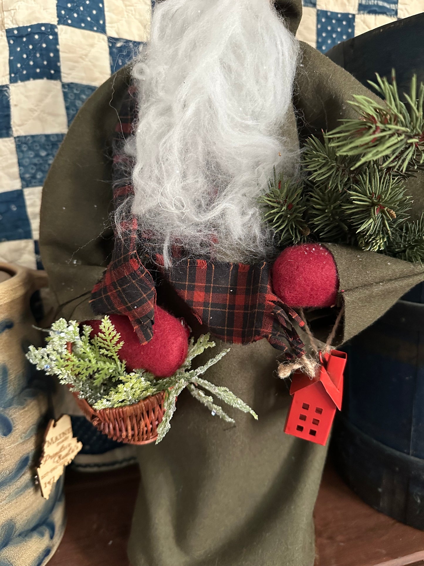 Dressed in an army green top coat and a cozy plaid scarf, Sidney Santa is the perfect embodiment of winter warmth. He carries a charming tin house, adding a nostalgic, rustic touch to his look, while in his arms, he holds a bundle of fresh greens, symbolizing the beauty of nature and the season. Along with a basket of additional greens, this Santa brings the perfect combination of natural beauty and holiday spirit to your home.