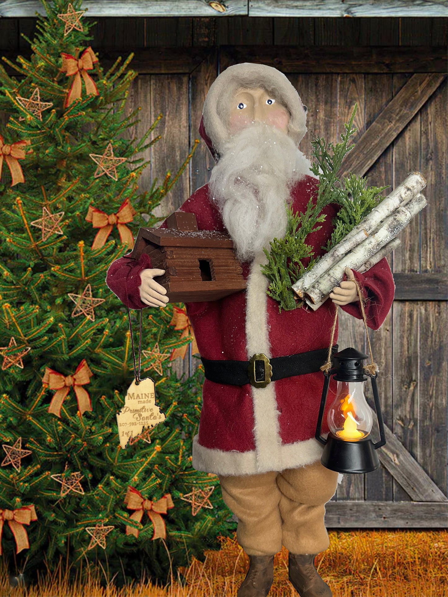 This handcrafted Santa by Homestead Primitives is a charming blend of rustic artistry and vintage charm. His face is sculpted from clay, giving him a unique, expressive look full of old-world character. Dressed in hand-sewn clothes made from aged fabrics, he carries the warmth of tradition in every stitch. Vintage accessories, carefully selected and thoughtfully placed, complete his timeless appeal. Each Santa is one-of-a-kind, bringing a touch of nostalgia and holiday magic to any home.